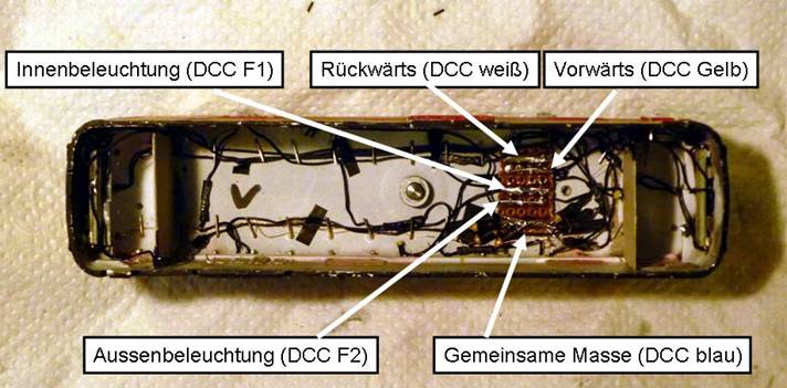 Digitalisierung: Für die Digitalisierung habe ich eine 8-polige NEM-Schnittstelle eingebaut, um später einen Funktionsdekoder für Animationen und Sound einbauen zu können. Für‘s erste wurde ein Lenz DCC Decoder Silver ausgewählt. Der Decoder passt in das Gehäuse ohne irgendwelche Fräsarbeiten, lediglich die Motorkontakte der Anschlussplatine mussten zusammen mit dem Kondensator und der Drossel entfernt werden. Der Decoder wurde entsprechend der Anleitung eingebaut und benötigt keinerlei Änderungen an den CV-Einstellungen (bis auf die Lokadresse CV3) bei dieser Lok. |