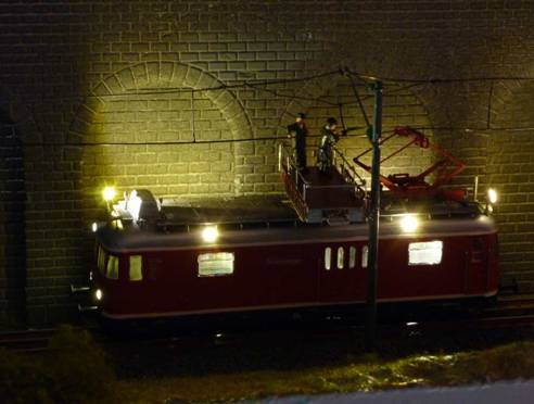 · Fahrlicht, Schlusslicht und Führerstandsbeleuchtung wurden richtungsabhängig zusammen-geschaltet (13 SMD-Leds). · Arbeitsraum Innenbeleuchtung (3 SMD-Leds) auf F1 gelegt. · Außenarbeitsbeleuchtung (6 Leds) auf F2. Für die Arbeitsleuchten an den Seiten wurden 4 0603 SMD-Leds mit Sekundenkleber in Lampenkörper aus Papier eingeklebt und in Reihe mit Kupferlackdraht an einen 1 kOhm Widerstand angeschlossen. Die 2 Suchscheinwerfer auf dem Dach bekamen ebenfalls mit 0603 Leds eine Beleuchtung. · Alles warm-weiße Leds |