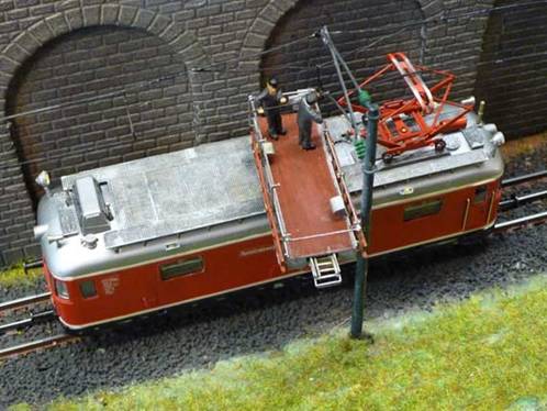 · VT 55 der Deutschen Bundesbahn · Günther-Bausatz B055 (Weißmetall) · LÜP: 161 mm · Gewicht 403 g · Günther-Fahrwerk B055/1 Bühler Motor, Schwungmasse, Einachsantrieb · 11mm Trix-Express-Räder, 1 Haftreifen · LED-Beleuchtung (Eigenbau) · NEM 8-polige Schnittstelle · Lenz DCC Decoder Silver · Betriebsspuren · Bewegliche Arbeitsbühne, Schutzgeländer und Pantograph