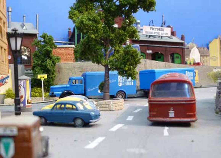 Oben: Blick aus der Mozartstraße auf die Fahrradfabrik „Victoria“. Die Fabrik entstand aus einem Fallerbausatz und wird auf der nächsten Seite ausführlich beschrieben. Die Mozartstraße dient als Wendeschleife des Faller Car- Systems in der Bahnhofsstraße. Der FCS-Umbau Krupp Titan „Stiebel Eltron“ (der LKW mit den 2 Motoren!)wird gleich nach links in einer Unterführung verschwinden, um dann hinter dem Bahnbus auf einem FCS-Parkplatz anzuhalten. |
