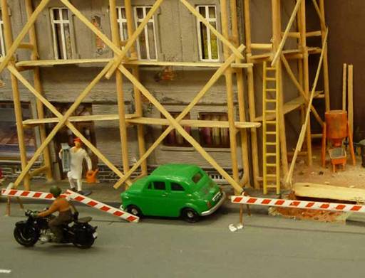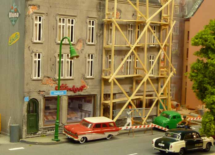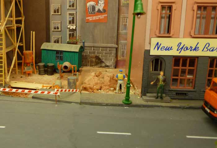 Links: „Baulücke in der Bahnhofs-straße“. Unübersehbar ist die Baustelle und so wird auch diese Baulücke bald mit einem der typischen 60er Jahre Wohn- und Geschäftshaus geschlossen werden. Die sichtbare Hintergrundkulisse entstand aus alten MZZ-Teilen und wurde mit zeit-genössischer Werbung versehen. Im Eckhaus wurde vor kurzem die „New York Bar“ eingerichtet.