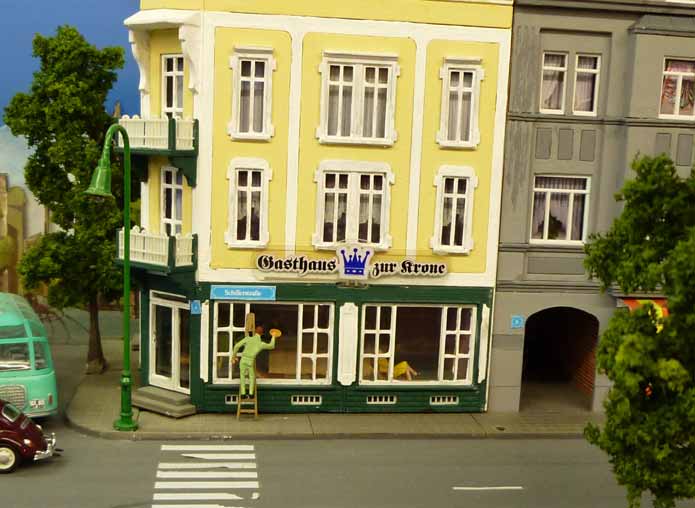Rechts: „Die „erste Adresse“ in Moosbach: „Lounge & Gasthaus zur Krone“. Der Fallerbausatz aus der „Schillerstraße“ Nr. 130925 wurde mit Dispersionsfarbproben aus dem Bau-markt vor dem Zusammenbau farblich angepasst und mit leichten Schmutz-spuren versehen. Die „Lounge“ bekam eine passende Inneneinrichtung. |