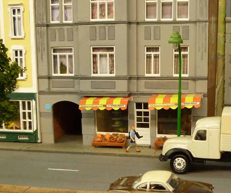 Unten: „Kolonialwaren Müller“ in der Bahnhofsstraße. Wir befinden uns noch in der Zeit, als es keine Supermärkte gab. Müller wird sich jedoch bald einer bekannten Einzelhandelskette anschließen. Der Fallerbausatz aus der „Goethestrasse“ Nr. 130915 wurde in der Mitte geteilt und steht direkt vor der Hintergrund-kulisse. Die Inneneinrichtung entstand aus den dem Bausatz beiliegenden Teilen. |
