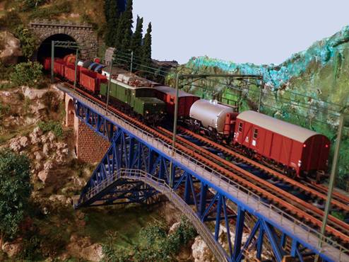 Da wird auch schon der Grund sichtbar: Mit lautem Brummen der Lüfter und klappernden Schützen kommt eine gewaltige E 94 mit ihrem langen Güterzug über die Brücke. |