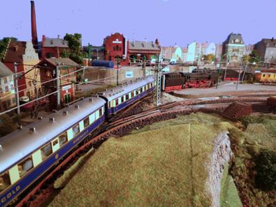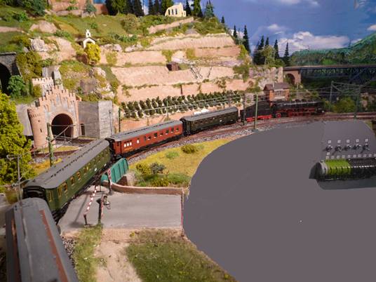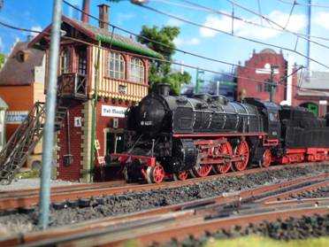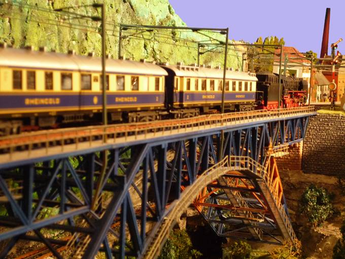 Jetzt pfeift unsere Lok, und gefolgt von einem immer schneller werdenden Stakkato der vier Zylinder beschleunigt unser Zug auf der Steigung aus dem Bahnhof heraus und rollt gleich über die große Stahlbrücke in Richtung Nuschelstadt auf die freie Strecke. |