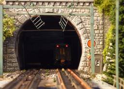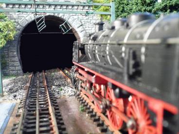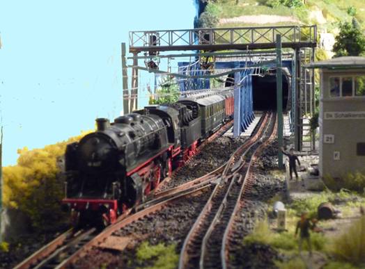 Rechts winkt noch der Stellwerksbeamte von Moosbach-Ost dem Lokpersonal zu, und dann geht’s auch schon über die große Stahlbrücke und in voller Fahrt mit den maximal zulässigen 120 Km/h in den kleinen Motzbergtunnel. |